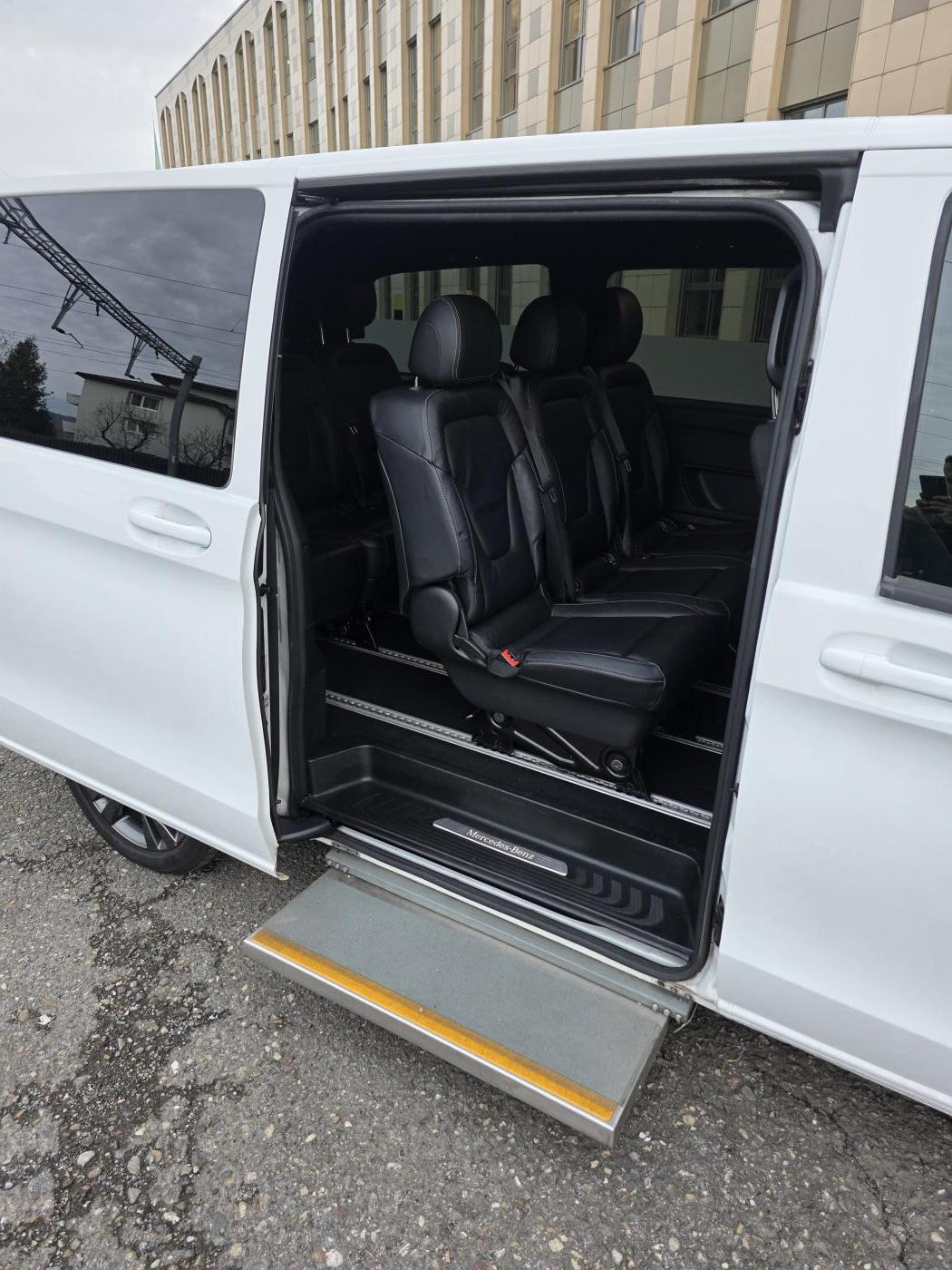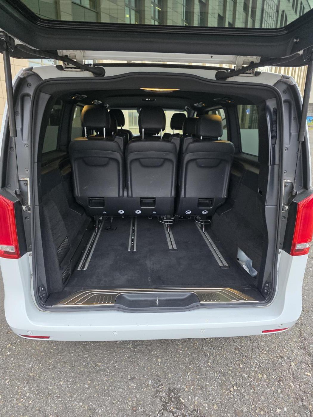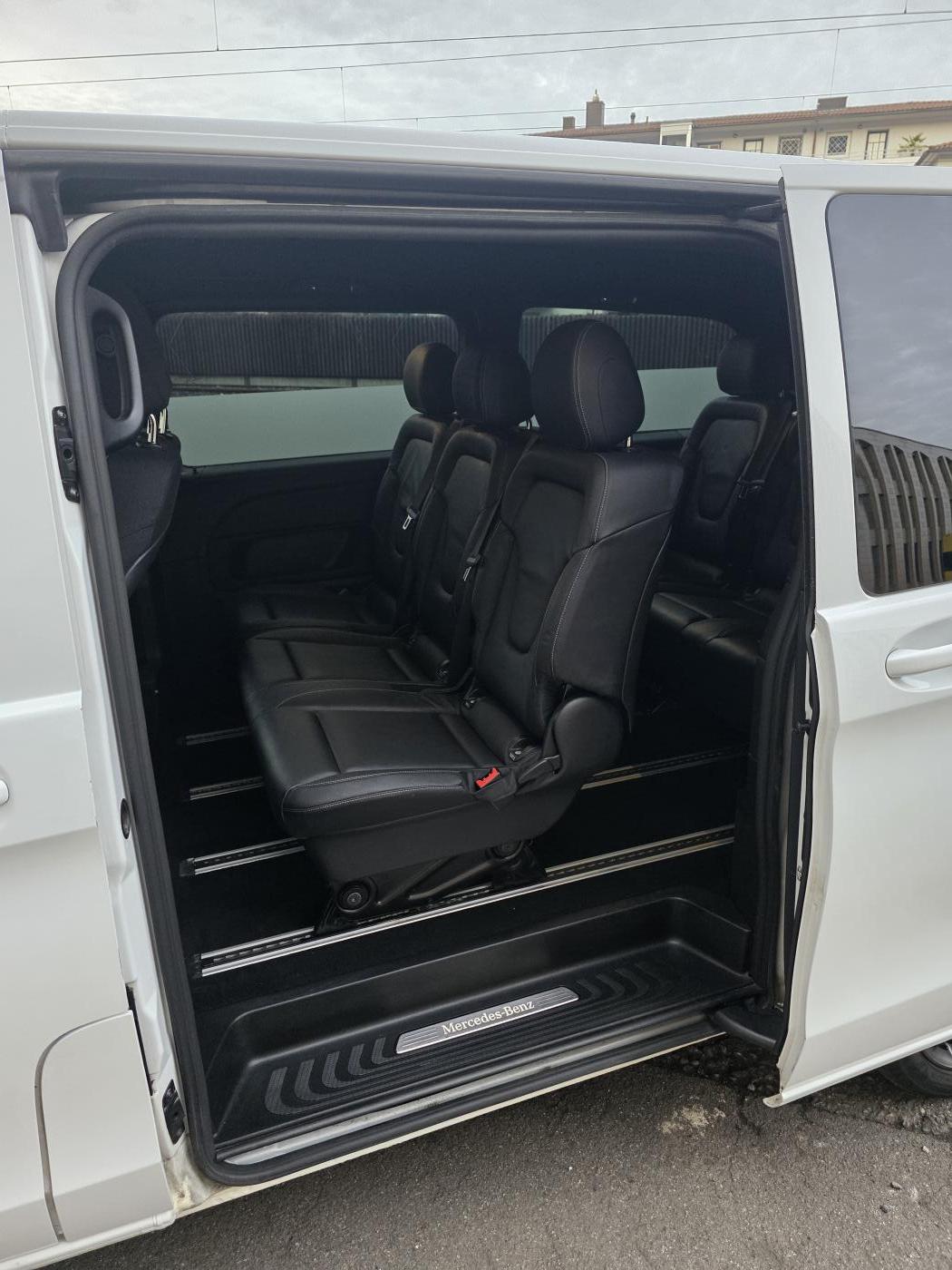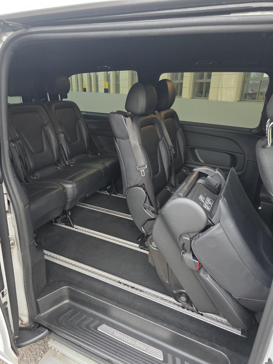 Aktuell ist das Fahrzeug mit 7 Sitzplätzen ausgestattet(Zwei Sitze vorne, zwei Einzelsitze hinten und eine 3er Bank in der zweiten Fondreihe). Auf Anfrage könnte man auch prüfen, ob 8 Sitzplätze verbaut werden könnten, bei Verfügbarkeit.